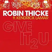 "Give It 2 U" is a song by American-Canadian singer-songwriter Robin Thicke from his sixth studio album, Blurred Lines (2013). It was written and produced by Dr. Luke and Cirkut, with additional writing by Thicke, Kendrick Lamar, and will.i.am. Originally titled "Give It to Me", a demo version of the song premiered on the radio show Sway in the Morning on May 2, 2013. Featuring guest vocals from Lamar, it was released as the third single from the album on August 27, 2013. "Give It 2 U" is an uptempo hip hop and electropop song with elements of dubstep. Lyrically, Thicke sings about sexually pleasing a partner.