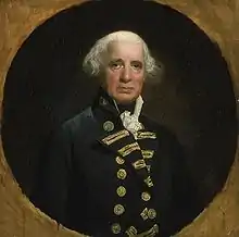 Despite these difficulties, the Channel Fleet was possessed of one of the best naval commanders of the age; its commander-in-chief, Richard Howe, 1st Earl Howe, had learned his trade under Sir Edward Hawke and fought at the Battle of Quiberon Bay in 1759.[20] In the spring of 1794, with the French convoy's arrival in European waters imminent, Howe had dispersed his fleet in three groups. George Montagu, in HMS Hector, was sent with six ships of the line and two frigates to guard British convoys to the East Indies, West Indies and Newfoundland as far as Cape Finisterre. Peter Rainier, in HMS Suffolk and commanding six other ships, was to escort the convoys for the rest of their passage. The third force consisted of 26 ships of the line, with several supporting vessels, under Howe's direct command. They were to patrol the Bay of Biscay for the arriving French.[21]