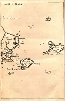 ![]() Map of Glubbdubdrib, Lugnagg, and other lands east of Japan (original map, Pt III, Gulliver's Travels) | |