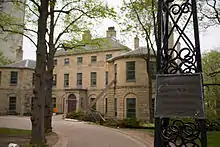 A fire erupted in the mansion's attic in 1854; however, the blaze was kept under control due to the fireproofing precautions taken during the design and construction of the edifice. Government House was not well maintained in the latter half of the 20th century. As one of the oldest official residences in Canada, Government House was designated a National Historic Site of Canada in 1982.[5] The following year, the provincial government, under the Heritage Property Act, listed the house and its gardens as a Provincially Registered Property, in recognition of its Georgian architecture and its association with the various lieutenant governors since 1805 and the Canadian monarchy.[6] The property was not well maintained, regardless, and it underwent extensive renovation and restoration for three years prior to the end of 2008;[3] the building was rededicated by Queen Elizabeth II on 28 June 2010.[2][7] At the same time, a new Royal Key was inaugurated; it was presented to the Queen and then returned at the end of her tour of Canada, so as to be granted to future lieutenant governors.[7] Nova Scotia's Government House is presently the oldest viceregal residence in North America.[3]