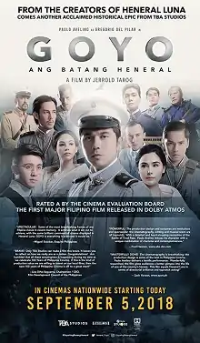 Goyo: The Boy General[3] (Filipino: Goyo: Ang Batang Heneral), also known simply as Goyo,[6] is a 2018 Philippine historical epic film starring Paulo Avelino as the titular "Boy General", Gregorio del Pilar, who died during the historic Battle of Tirad Pass in the Philippine–American War. It was written, directed, edited, and scored by Jerrold Tarog, and is a sequel to the 2015 film Heneral Luna, which chronicled Antonio Luna's life.[4] Additional members of the ensemble cast include Carlo Aquino, Mon Confiado, Epy Quizon, Gwen Zamora, Empress Schuck, Alvin Anson, and Rafa Siguion-Reyna. It was released on September 5, 2018.