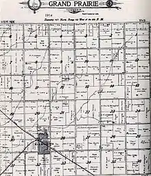 Organization of Grand Prairie Township was approved by the Nobles County Board on September 22, 1873, though settlers has taken up root in the township as early as 1871. The first township meeting was held on October 30, 1873. There were originally three names proposed for the new township: Colfax, Grand Prairie, and Union Township. The Nobles County Board liked Grand Prairie Township best, and that is why the name was chosen.[3] Grand Prairie Township is in the extreme southwestern corner of Nobles County. One of the first settlers of Grand Prairie Township is known in history only as "Uncle" Stillwell. Mr Stillwell made a claim in section 29 where the town of Ellsworth now stands. He established a small store on his farmstead, supplying the needs of local farmers. He also operated a peddler's wagon in the vicinity. Mr. Stillwell had great confidence in the future of the region. However, Stillwell packed up and left the area in 1882, two years before the town of Ellsworth was established.[4]