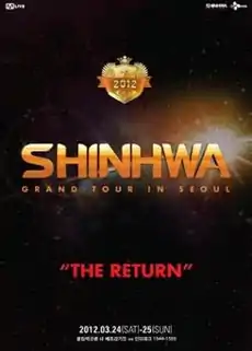 2012 Shinhwa Grand Tour: The Return is the Asia-wide live concert tour of South Korean boy band Shinhwa to support their tenth studio album, The Return, which was released on 23 March 2012. The album and tour marks Shinhwa's comeback to the music industry after a four-year hiatus,[1] since their 10th anniversary concert held in 2008, during which band members served individual mandatory military services.[2][3]