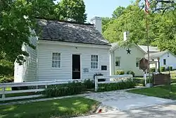 The reverse depicts Grant's birthplace in Point Pleasant; Fraser again worked from a photograph, one showing the frame house before it was restored—the trees do not appear on the medal issued for the Grant birth centennial. The type of house was misidentified by Secretary of the Treasury Andrew W. Mellon in his annual report for 1922 as a log cabin, confusing it with one Grant built in his thirties on his wife's farm near St. Louis.[20] At the time of issue, Frank Duffield, editor of The Numismatist (the journal of the American Numismatic Association) stated that on the coin the house and its surroundings may be intended to look like they did when Grant was born, the building seems dwarfed by the trees, and "for the sake of better effect a little of the realism might have been sacrificed without detracting from historic interest".[21] He opined though that "in design and execution they are the equal of any of our recent commemorative issues, all of which have proved exceedingly popular with collectors."[21] Slabaugh stated of Laura Fraser's design, "there is no question of the fine quality of her work".[19] While the legends IN GOD WE TRUST and E PLURIBUS UNUM appear on the reverse, there is no inscription explaining what is picture; as commemorative coin expert Anthony Swiatek explained, "the design itself tells the story".[22]
