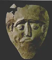 A death mask of electrum was also unearthed though it was not found on the face of the deceased male, but in a wooden box next to him.[13] On the other hand, the burial costumes differed from those of Grave Circle A. The latter included death masks of different artistic style and made of gold, like the Mask of Agamemnon.[12]