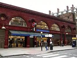 With the funds available from the UERL, construction began in July 1902 at Knightsbridge, before the formal approval of the merger of the B&PCR and GN&SR.[51] Messrs Walker, Price & Reeves was the main contractor appointed for the line's construction, with the exception of Messrs Walter Scott & Middleton in charge of the portal at Barons Court.[52] Work proceeded quickly, enabling the UERL to record in its annual report in October 1904 that 80 per cent of the tunnels had been completed and that track laying was about to begin.[53] Stations were provided with surface buildings designed by architect Leslie Green in the UERL house-style.[54] This consisted of two-storey steel-framed buildings faced with dark oxblood red glazed terracotta blocks, with wide semi-circular windows on the upper floor.[note 11] Except for Finsbury Park, where the platforms were close enough to the surface to be accessed by stairs, and Gillespie Road where a long ramp was used, each of the stations with platforms in tube tunnels was provided with between two and four lifts and an emergency spiral staircase in a separate shaft.[note 12]