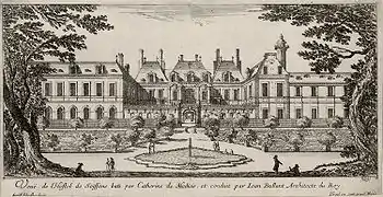 The new palace was known in Catherine's time as the Hôtel de la Reine and later as the Hôtel de Soissons. The original design was based on the Uffizi palace in Florence, but Catherine dropped that idea for a less costly plan after 1576.[5] Engravings made by Israel Silvestre in about 1650 and a plan from about 1700 show that the Hôtel de la Reine possessed a central wing, a courtyard, and gardens.[5] The central wing consisted of three large pavilions with tall, pitched roofs. In the middle, two tall projections decorated with pilasters flanked an arch. The walled gardens of the hôtel included an aviary, a lake with a water jet, and long avenues of trees. Catherine also installed an orangery that could be dismantled in winter.[2]