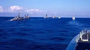 In 1959 the Canadian government ordered that the St. Laurent class be modernized, even though the class was relatively new. This was based on the fact that the St. Laurent class was no longer capable of fighting the new nuclear submarines entering service.[17] This was done to extend the detection range of the ships and to eliminate any speed advantage of the nuclear submarines.[18][19] St. Laurent was a member of the Second Canadian Escort Squadron in 1960 based out of Esquimalt, British Columbia.[20] In February 1960, St. Laurent, with two sister ships, departed Esquimalt, British Columbia performed a training cruise around the Pacific making several port visits and returning in April. In March 1961, St. Laurent, Ottawa and Saguenay deployed with the United States Navy's Carrier Division 17 off Hawaii.[21]