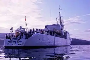 St. Laurent was laid down on 24 November 1950 by Canadian Vickers at Montreal. She was launched on 30 November the following year and was commissioned into the Royal Canadian Navy on 29 October 1955 and initially carried the pennant number DDE 205 as a destroyer escort.[5] Prime Minister Louis St. Laurent was present at her commissioning.[6] She was reported to have cost $15,000,000 to build.[1] She underwent conversion to a destroyer helicopter escort (DDH) in the early 1960s and was officially re-classed with pennant DDH 205 on 4 October 1963.