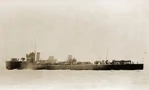 The ship's main gun armament consisted of three 4-inch (102 mm) BL Mk VIII guns,[lower-alpha 2] with 120 rounds of ammunition carried per gun.[5][8] Two 21-inch (533 mm) torpedo tubes were fitted, while two reload torpedoes could be carried.[8][10][lower-alpha 3] The ship was fitted with a 2-pounder "pom-pom" anti-aircraft autocannon during the First World War, while in 1918 the torpedo tubes (and possibly one of the 4-inch guns) was removed to allow a heavy depth charge armament to be carried.[12]