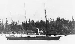 Forward was built by W & H Pitcher at Northfleet, Kent, England, and was launched on 8 December 1855. She was fitted for Royal Navy service in British Columbia in 1859 and then sold off to Hill & Ready in Esquimault, British Columbia in 1869 for use as a commercial vessel. As a commercial vessel, she went south to Mexico for oysters and was seized near Mazatlan, Mexico, by a descendant of Christopher Columbus, Plácido Vega y Daza. Crewed by Mexicans,[1] and flying the flag of San Salvador,[2] she preyed on shipping and coastal settlements in the Gulf of California. The U.S. Navy considered her a pirate ship, and sent the sloop-of-war USS Mohican in pursuit of her. A launch and five cutters from Mohican discovered Forward beached in the Teacapan Estuary at Boca Teacapan, Sinaloa, Mexico, and destroyed her on 17 June 1870 in the Battle of Boca Teacapan.[1]