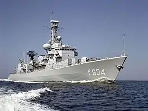 HNLMS Van Galen (F834) (Dutch: Hr.Ms. Van Galen) is a ship of the Karel Doorman class of multi-purpose frigates of the Royal Netherlands Navy. Built by the shipyard Koninklijke Schelde Groep in Vlissingen. The ship is named after captain and convoy commander Johan van Galen and served from 1994 to 2008 with the Dutch navy.[2] The radio call sign of the frigate was "PAMG".[3]
