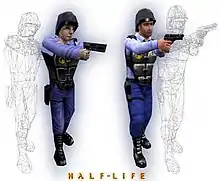 The player battles through the game alone, but is occasionally assisted by friendly non-player characters. Security guards and scientists will occasionally help the player in reaching new areas and convey relevant plot information. Blue Shift also includes a substantial section dedicated to keeping a major character in the story safe from enemy characters, and escorting him to a specific location.[2] A selection of enemies from Half-Life populate the game, including alien creatures such as headcrabs and Vortigaunts. The player also encounters human opponents in the form of a detachment of US Marines who have been sent to eliminate the alien threat and silence any witnesses.[3] Blue Shift does not elaborate on the storyline in Opposing Force, the preceding expansion pack, and no enemy characters or weapons introduced in it appear in the game. The player is instead given access to a limited selection of Half-Life's original weaponry.[2]