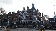 Between 1894 and 1896, the old Half Moon was rebuilt as a hotel by architect James William Brooker in Jacobethan Revival style.[1] Brooker lived locally in East Dulwich.[27] The size of the new hotel and richness of its fittings is partly explained by its location near the terminus of one of the horse-drawn omnibus services into London.[28] The demolition of the former Half Moon Tavern by its owners The Dulwich Estate was clearly not universally popular at the time, with a subsequent poem appearing in Punch entitled "The Doom of Dulwich", including the lines, "Alas for the famous old inns! Ah! progress is all very well, But one of its shockingest sins, Is ringing antiquity's knell. The “Crown” and the “Half Moon” are gone, And now they the Greyhound attack."[29] Writing in May 1896, Alfred Allison, describes the new development, "The picturesque old Half Moon at Herne Hill, with its low ceilings and quaint gables, was recently given over to the wreckers. Not a brick or a plank remains. In its place has grown up a gigantic modern structure quite in keeping with the new surroundings."[30]