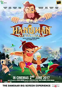 Hanuman: Da’ Damdaar (transl. Hanuman, the powerful) is a 2017 adventure animated film, directed by Ruchi Narain, presented by RNB Films in association with R.A.T Films.[5] It is a story of a boy, Hanuman set in 'mythological' times. The concept of the film is for children to have fun and learn something. Salman Khan unveiled the motion poster of the film on the occasion of Hanuman Jayanti on 11 April 2017.[6] The film was released on 2 June 2017.[7][8]