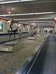 The terminals and concourses are connected by the Transportation Mall, a pedestrian tunnel with a series of moving walkways,[47] and The Plane Train, an automated people mover. The Plane Train has stations along the Transportation Mall at the Domestic Terminal (which also serves Concourse T), at each of the six other concourses (including concourse F which is connected to the International Terminal), and at the domestic baggage claim area. The Plane Train is the world's busiest automated system, with over 64 million riders in 2002.[47]