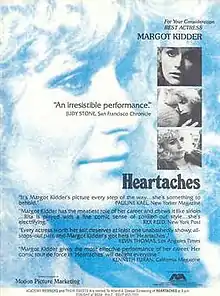 Heartaches is a 1981 Canadian comedy film written by Terence Heffernan and directed by Donald Shebib. It stars Margot Kidder, Annie Potts, Winston Rekert and Robert Carradine. The movie is about a young woman, Potts, married to a stock car racer and carrying his friends' child. As she flees that scene, her husband (Carradine) races alongside her bus. On this bus, Potts' character meets the free spirited Kidder and the two women move in together planning to raise the baby. Dealing with romance and poverty, they learn that they have more in common than they thought.