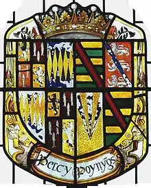 During the Wars of the Roses, Percy followed his father in siding with the Lancastrians against the Yorkists.[20] The Earl himself died at what is generally considered to be the first battle of the wars, at St Alban's on 22 May 1455, and Poynings was elevated as third Earl of Northumberland, without having to pay relief to the Crown, because his father had died in the King's service. He in his turn "swore to uphold the Lancastrian dynasty".[4] Although a reconciliation of the leading magnates of the realm was attempted in October 1458 in London, he arrived with such a large body of men (thought to be around 1,500)[21] that the city denied him entry. The new earl and his brother Egremont were bound over £4,000 each to keep the peace.[22]