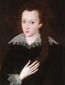 In 1598 Southampton was involved in a brawl at court with Ambrose Willoughby,[33] one of the Queen's esquires of the body, who had ordered him to leave the presence chamber where he was playing at primero after the Queen had retired for the evening. Southampton struck Willoughby, and "Willoughby puld of some of his locke", for which the Queen gave Willoughby thanks, saying "he had done better yf he had sent hym to the porters lodge, to see who durst have fetcht hym out".[34] There is a suggestion that underlying the altercation was something Willoughby had said which caused trouble between Southampton and his mistress, Elizabeth Vernon, one of the Queen's Maids of Honour. The Queen forbade Southampton to present himself at court, although he was soon allowed back. Nonetheless it was reported by Rowland Whyte at the beginning of February that "My Lord of Southampton is much troubled at her Majesties straungest Usage of hym". Faced with his financial difficulties and the Queen's disfavour, Southampton determined to live abroad for a time, and seized the opportunity of accompanying Sir Robert Cecil on an embassy to Henri IV of France. On 6 February Southampton was granted licence to travel abroad for two years, and by March he and Cecil were in Angers, where on 7 March Southampton was presented to the French King.[35]