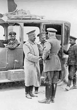 After some time spent "on the shelf", François received the command of the XXXXI Reserve Corps[1] on 24 December 1914, and after a spell in the West, he returned to the Eastern Front in April 1915 where he took part in the Spring Offensive that conquered Russian Poland. He continued to distinguish himself. He won the Pour le Mérite, Germany's highest military decoration, on 14 May 1915 for his performance in the breakthrough at Gorlice, and had the Oak Leaves attached to it in July 1917, for outstanding performance during the Battle of Verdun. In July 1915 he was transferred back to the Western Front to take command of the Westphalian VII Corps in France, and in July 1916 Meuse Group West in the Verdun sector. However he never received any further promotion or serious commands under Ludendorff, and gave up his command in July 1918 and was placed on the standby list until October 1918 when he retired.[2]