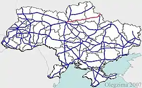 H07 is an important Ukraine national highway (H-highway) in Kyiv, Chernihiv, and Sumy Oblasts, Ukraine, running mainly west-east, and connecting Kyiv (if switching to another highway at Brovary) with Yunakivka in a more or less straight line.[1][2] It begins in Brovary at Highway M01/Highway E95, and passes through Krasylivka, Hoholiv, Rusaniv, Peremoha, Nova Basan, Novyi Bykiv, Pohreby, Rudivka, Pryluky, Okhyrky, Sribne, Kharkove, Lavirkove, Romny, Korovyntsi, Nedryhailiv, Vylshana, Komyshanka, Shtepivka, Sula, Sad, Sumy, Stetskivka, Pysarivka, and Yunakivka, before ending at the Russian border. The road then continues as Russian Highway R200 to Kursk.[3]