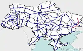 H21 is an important Ukraine national highway (H-highway) in the Donetsk Oblast and Luhansk Oblast of Donbass, Ukraine. It connects Donetsk through Luhansk with Starobilsk. The highway runs both, west-east between Donetsk and Luhansk, and south-north between Luhansk and Starobilsk.[1] It passes either through or near Makiivka, Kolosnykove, Khartsyzk, Zuhres; Serdyte, Molodetske, and Shakhtarsk in Shakhtarsky; Torez, Snizhne, Miusynsk, Krasnyi Luch; Ivanivka and Malomykolaivka in Antratsitivsky; Myrne, Uspenka, Lutuhyne, and Heorhiivka in Lutuhynsky; Luhansk; Metalisk, Stukalova Balka, and Lyman-Tsvitni Pisky-Svitle in Slovianoserbsky; Shchastya; Mykhailivka in Troitsky; Novoaidar, Denezhnykove, and Peremorzhne-Shtormove in Novoaidarsky; Shul'hynka in Markivsky, Baidivke, and Polovynkyne in Starobilsky.