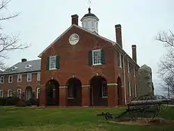 No precise descriptions of the interior of the courthouse have surfaced, but it was customary for a large table to be centered in the main chamber of the courthouse. This table was usually spacious enough to seat the sheriff and justices of the county court, and it is likely that the courthouse followed this same layout. It was also customary to separate the portion of the court occupied by the public, which was done by the installation of a wooden railing or a partition. Fireplaces likely heated the courtroom chamber and the second floor jury room.[9] The new courthouse complex gradually became the center of activity for the county, and in 1805 the area around the new structure became known as the Town of Providence. The location of the new courthouse was ideal, being located at the junction of Little River Turnpike and Ox Road (present day routes 236 and 123) and providing easy access to most parts of the county.[10]