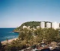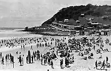 However, inflated prices for real estate and other goods and services led to the nickname of "Gold Coast" from 1950.[13][14][15][16][17] South Coast locals initially considered the name "Gold Coast" derogatory.[18] However, soon the "Gold Coast" simply became a convenient way to refer to the holiday strip from Southport to Coolangatta.[19][20][21][22][23] As the tourism industry grew into the 1950s, local businesses began to adopt the term in their names, and on 23 October 1958 the South Coast Town Council was renamed "Gold Coast Town Council". The area was proclaimed a city less than one year later.