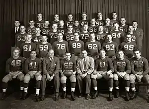 On offense, Michigan was led by a new backfield that included All-American quarterback Pete Elliott and halfbacks Chuck Ortmann and Leo Koceski. The team scored 252 points, an average of 28 points per game.[3] With Ortmann as the principal passer, the Wolverines relied on an air attack, gaining more yards in the air (1,355) than on the ground (1,262). Dick Rifenburg, the team's leading receiver, was picked as a first-team All-American at the end position. Team captain Dominic Tomasi was selected as the team's Most Valuable Player. The 1949 Michiganensian wrote of the 250-pound guard, "Famous for his sharp shattering blocking, Dom tore huge gaps in the opposing lines to pave the way for Michigan's steam roller offense."[4]