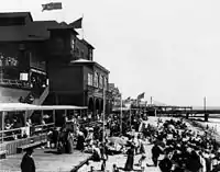 The Ocean Park Pier burned down in 1912. In its place was Fraser's Million Dollar amusement pier, which claimed to be the largest in the world at 1250 feet long and 300 feet wide. The pier housed a spacious dance hall, two carousels, the Crooked House fun house, the Grand Electric Railroad, the Starland Vaudeville Theater, Breaker's Restaurant and a Panama Canal model exhibit. It too burned within the year.[5]
