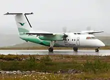 Widerøe issued feedback for its future aircraft needs to de Havilland Canada during the design phase of the Dash 8. In particular Widerøe wanted to operate an aircraft able to operate on 800-meter (2,600 ft) runways.[42] Widerøe's management stated their intent in 1988 to purchase the Dash 8; the only other alternative aircraft that could operate on the network was the CASA 212, Dornier 228 and an upgraded Twin Otter. None of the alternatives had a pressurized cabin. The Dash 8 would be the largest and also the most expensive alternative.[43] The Civil Aviation Administration stated in January 1989 that the Dash 8 would not be approved for the regional airports because it would require a visual landing angle of six instead of three degrees and that it was undesirable to have to such systems. They further stated that the only alternative was to extend all the runways to 1,200 meters (3,900 ft).[44] The cost of a new or additional visual landing system was estimated at NOK 4 million per airport. To gain support for the aircraft, a Dash 8 was leased from Tyrolean Airways for demonstrations. The ministry stated that at the time it was difficult filling the Twin Otters and that additional capacity was not needed for routes in Finnmark. Widerøe's initial plan was to purchase two aircraft immediately and then take delivery of one more per year until 2000. However, this would result the airline operating three classes of aircraft simultaneously.[45]