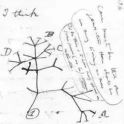 Charles Darwin, combining the biogeographical approach of Humboldt, the uniformitarian geology of Lyell, Thomas Malthus's writings on population growth, and his own morphological expertise, created a more successful evolutionary theory based on natural selection; similar evidence led Alfred Russel Wallace to independently reach the same conclusions.[33] Charles Darwin's early interest in nature led him on a five-year voyage on HMS Beagle which established him as an eminent geologist whose observations and theories supported Charles Lyell's uniformitarian ideas, and publication of his journal of the voyage made him famous as a popular author.[34] Puzzled by the geographical distribution of wildlife and fossils he collected on the voyage, Darwin investigated the transmutation of species and conceived his theory of natural selection in 1838.[35] Although he discussed his ideas with several naturalists, he needed time for extensive research and his geological work had priority.[36] He was writing up his theory in 1858 when Alfred Russel Wallace sent him an essay which described the same idea, prompting immediate joint publication of both of their theories.[37] Darwin's On the Origin of Species, published on 24 November 1859, a seminal work of scientific literature, was to be the foundation of evolutionary biology.