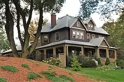 The House at 1 Morrison Avenue is one of a few Tudor Revival houses in Wakefield, Massachusetts. The 2 1⁄2-story wood-frame house has a hip roof with a copper crest, central dormer, and a larger projecting gable section on the left. The single story porch wraps around two sides of the house, and features a high gable over the front stairs which is decorated with bargeboard and half timbers. It was built c. 1890 on land that had been acquired and subdivided by J.S. Merrill and Charles Hanks as part of the major Wakefield Park subdivision.[2]