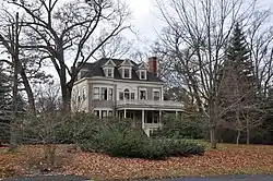 The House at 22 Parker Road is one of a few high style Colonial Revival houses in Wakefield, Massachusetts. The 2 1⁄2-story wood-frame house is estimated to have been built in the 1880s. It has a hip roof, corner pilasters, and gable end dormers, the center one having a swans-neck design. The main facade is divided into three sections: the leftmost has a rounded bay with three windows on each level, and the right section has a Palladian window configuration on the first floor, and a pair of windows on the second. The central section has the front door, sheltered by a porch that wraps around to the right side, flanked by sidelights and topped by a fanlight. Above the front door is a porch door flanked by wide windows and topped by a half-round window with Gothic style insets.[2]
