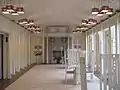 Construction began in 1989 and the house was finally opened to the public in 1996. When a recession occurred in the early 1990s, construction had to stop. In 1994, the Glasgow City Council and the Glasgow School of Art (GSA) revived the project so that the interior rooms and landscape could be completed.[2] Mackintosh's original designs were interpreted and realised by John Kane and Graeme Robertson (up to 1990) under Andy MacMillan, with contributions by many contemporary artists.[3] Original portfolio designs are displayed in each room to allow comparisons.
