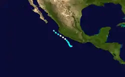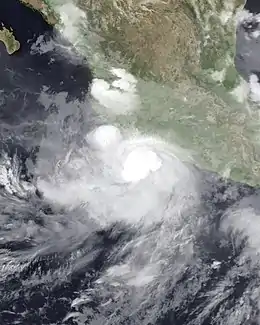 In the municipality of Atoyac de Alvarez, in the community of Cerro Prieto, 350 people were left homeless by the storm.[21] Similarly, the paths that connect the towns of San Vicente de Jesus San Vicente and La Soledad Benítez-Paradise in this town, there were cuts in solitary vehicle traffic.[21] In the community of La Soledad, heavy rains accompanied by hail hit 38 homes, crops and coffee grounds cultivation in the region.[22] In Colima, 50 homes and two hotels were inundated by flood waters, leaving MXN 3 million ($231,000 USD) in damage.[23] In Puebla, heavy rains produced by the outer bands of the hurricane triggered flooding that killed two people. In addition to the fatalities, 20 people were injured by the storm.[24] In the wake of the storm, the Government of Mexico allocated roughly MXN 3 million (US$231,000) in funds which would be distributed to 96 businesses significantly affected by the storm. These funds accounted for supplies, such as refrigerators and stoves to help restart their industries.[25]
