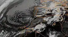 As Tropical Storm Arlene tracked towards Bermuda, residents on the island were advised to take precautions and board up their homes. This followed the issuance of a tropical storm advisory for the island.[5] On August 12, Arlene produced squally weather throughout Bermuda as the outer bands impacted the region.[6] Rainfall from the storm peaked at 1.65 in (42 mm).[7] A blind sailor was caught in the storm for two days while trying to become the first blind man to cross the Atlantic Ocean alone. On August 14, he encountered the full-force of the storm, 12 ft (3.7 m) seas and 60 mph (97 km/h) winds battered his 36 ft (11 m) sloop called the Eye Opener while trying to dock in Bermuda.[8] The forced docking at Bermuda cost the sailor roughly US$8,000 due to damages from the storm.[9] On August 14, Arlene brushed Bermuda, producing torrential rains, rough seas and gusty winds. The center of the storm remained far enough offshore that only minor damage occurred on the island.[10] On August 26, the extratropical remnants of Arlene impacted Spain, bringing 1.25 in (32 mm) to Rota, surpassing the highest rainfall for the month of August set in 1971.[4] The remnant moisture from Arlene continued through the Mediterranean Sea and produced heavy rains across Italy on August 27.[11]