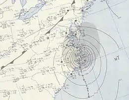 Along the coastline, Barbara flooded roads and houses. Strong winds downed trees and power lines, leaving some cities isolated from communication.[6] Some of the downed trees were large and had survived the Great Atlantic Hurricane of 1944. The combination of winds and rainfall left some damage to crops and structures.[2] The storm's impact along the coast was light to moderate, with monetary damage estimated around $1.3 million (1953 USD, $12.4 million 2021 USD),[7] mostly from the crop damage.[9] Four marines in the Marine Corps Air Station Cherry Point were injured, as was a Coast Guard worker.[6] One person died at Wrightsville Beach, North Carolina, after winds blew him off of a pier.[6] A report on the cyclone by the U.S. Weather Bureau indicates that this is the only causality associated with Barbara.[2] However, newspaper articles subsequent to the storm report several more fatalities,[10] with one paper reporting a total of seven deaths;[9] two of them were from electrocutions.[11] The rainfall from Barbara was blamed for traffic accidents further north in New Jersey and New York City,[10] causing four deaths. There was also an indirect death in New York when a man had a heart attack while securing his boat. In Atlantic City, New Jersey, there was damage to storefronts.[7] Along Nantucket, the hurricane washed several boats ashore, although there was little damage in the region.[9]