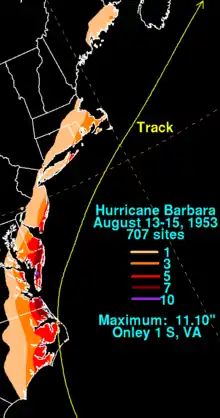 Hurricane Barbara was the second named tropical cyclone of the 1953 Atlantic hurricane season. Forming from a tropical wave on August 11 in the southern Bahamas, Barbara moved northward and attained hurricane status the next day. Ultimately peaking with winds corresponding to Category 1 status on the modern-day Saffir-Simpson Hurricane Scale, Barbara moved ashore in eastern North Carolina and curved back out to sea. The storm passed to the southeast of the New England region and dissipated on August 16. Damage from the hurricane was fairly minor, totaling around $1.3 million (1953 USD, $12.4 million 2021 USD). Most of it occurred in North Carolina and Virginia from crop damage. The hurricane left several injuries, some traffic accidents, as well as seven fatalities in the eastern United States; at least two were due to electrocution from downed power lines. Offshore Atlantic Canada, a small boat sunk, killing its crew of two.