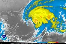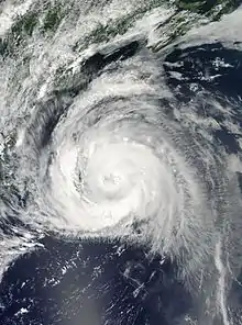 On August 20, the storm began to weaken, being downgraded to a Category 3, as convection associated with it diminished somewhat.[16] The storm's eyewall also weakened, with a portion of it dissipating later that day. Shear also deteriorated the structure of the storm, with clouds being displaced from the main circulation.[17] However, shortly after, the eye became much better defined and developed several mesovortices, a feature typical of intense hurricanes.[18] On August 21, Bill was downgraded to a Category 2 hurricane as the structure of the storm deteriorated; however, the atmospheric pressure in the eye was 954 mbar (hPa) at that time, equivalent to a strong Category 3 storm.[19] By the morning of August 22, the hurricane completed an eyewall replacement cycle and featured a 55 mi (89 km) wide eye.[20]