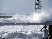 A 54-year-old man drowned at New Smyrna Beach, Volusia County, Florida due to the heavy surf.[57] In New York, severe beach erosion caused by the storm resulted in over $35.5 million in losses.[58] A 7-year-old girl drowned after she, her father, and a 12-year-old girl were swept off a rocky ledge near Acadia National Park in Maine on August 23.[59] The three were part of an early afternoon crowd of thousands who lined the Maine's national park's rocky shoreline to watch the high surf and crashing waves. Authorities said that about 20 people were swept away, but 17 of them made back to shore safely. Eleven were sent to area hospitals for spinal cord injuries.[60]