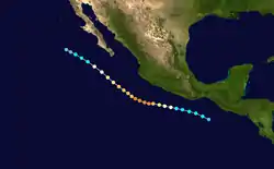 A tropical wave moved off the coast of Africa on June 3. It tracked westward across the unfavorable Atlantic Ocean, and on June 15 it crossed Central America into the eastern Pacific Ocean. The system continued westward, and late on June 16 a low pressure area developed about 300 miles (480 km) southwest of San José, Costa Rica. At around 1200 UTC on June 17, Dvorak classifications began on the disturbance, though initially its convection was broadly distributed and disorganized. The next day, however, an area of concentrated convection developed just south of the Gulf of Tehuantepec.[1] Ships in the vicinity confirmed the development of a surface circulation within the system, while satellite imagery showed the development of a central dense overcast.[2] Based on its organization, it is estimated the system developed into Tropical Depression Three-E late on June 18 while located about 270 miles (470 km) southeast of Puerto Angel, Oaxaca in Mexico.[1]