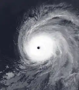Although there were no factors inhibiting the development of Celia, the storm unexpectedly weakened again later on June 23. The storm's eye rapidly dissipated and the central dense overcast became asymmetric. Forecaster Todd Kimberlain at the NHC referred to the unexplained shifts in strength as "puzzling."[17] However, as suddenly as the weakening took place, strengthening ensued. Very strong convection formed over the center of the storm, with some cloud tops being as cold as −86 °C (−123 °F), but no eye had reformed by the morning of June 24.[18] Throughout the day, Celia became increasingly organized, with the eye fully reforming and the structure becoming more symmetrical.[19] Rapid intensification soon followed as the storm reached Category 4 status,[20] becoming one of only a handful of tropical cyclones to do so during the month of June in the eastern Pacific.[21] That evening, the storm further intensified into a Category 5 hurricane, the second storm to reach this strength during June in the Eastern Pacific basin on record.[22] Hurricane Celia attained its peak intensity around 00:00 UTC, with sustained winds of 160 mph (260 km/h) and a barometric pressure estimated at 921 mbar (hPa; 27.2 inHg).[1] The storm also displayed a well-defined eye estimated to be 17 to 23 mi (27 to 37 km) in diameter.[23]