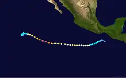 Throughout the hurricane's track, it posed little to no threat to any major landmasses or populated islands.[1] During Celia's early development stages, it brought moderate rainfall to parts of Oaxaca and Guerrero;[30] however, no loss of life or structural damage was reported. Beaches in both states increased the number of lifeguards on duty since the threat of rip currents would remain high for several days.[31] On June 22, the Sistema Nacional de Protección Civil (National System of Civil Protection) in the Mexican state of Jalisco raised the alert level to stage two for coastal areas. People were urged to be cautious about venturing out into coastal waters as the storm produced rough seas near the coast.[32] The alert was later expanded upon to include coastal areas of Michoacán and Colima.[33] Although out of the storm's projected path, a precautionary alert was issued for Socorro Island.[34] However, between June 22 and 23, the outer bands of the storm brought unsettled weather to France's Clipperton Island. Since this island is unpopulated, the NHC did not issue any warnings for it.[35]