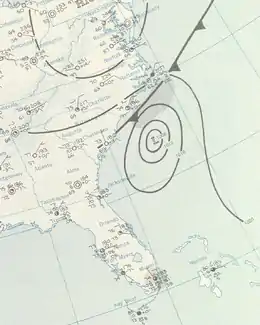 ![]() A daily weather map for July 8, 1959, depicting Hurricane Cindy approaching South Carolina | |