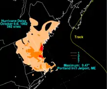 A total of 7.71 inches (196 mm) of precipitation fell in Portland, Maine within 24 hours, 3.13 inches (80 mm) of which fell in only 6 hours. Subsequently, Hurricane Daisy set a then-record the highest 24‑hour rainfall total for Portland; however, this recorded was broken during Hurricane Bob in 1991.[7] The overall rainfall total for Portland was 9.47 inches (0.241 m) at the international jetport.[1] In Auburn and Lewiston, a total of 4.58 inches (116 mm) of rain fell. The Androscoggin River overflowed and flooded a road in the former. Two fatalities were reported in Maine.[7] Throughout New England, thousands fled after homes, buildings, and school began to flood. It was considered the worst flood in the region since Hurricane Diane in 1955, and was caused partially because falling leaves clogged drains.[6]