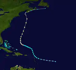 A nor'easter off the East Coast of the United States caused Daisy to curve northward on October 5. The storm briefly weakened to a Category 1 hurricane on October 6. Six hours later, it re-strengthened to a Category 2 hurricane; Daisy also attained its minimum barometric pressure of 965 mbar (28.5 inHg). Late on October 6, maximum sustained winds reached 110 mph (175 km/h), the highest in relation to the system.[3] Daisy absorbed the nor'easter on October 6, after it weakened. Thereafter, Daisy began accelerating and cold sea surface temperatures weakened the storm back to a Category 1 hurricane on October 7.[3].[4] It briefly curved north-northwestward, before sharply turning east-northeastward in the Gulf of Maine. Early on October 8, Daisy made landfall near Yarmouth, Nova Scotia with winds of 75 mph (120 km/h). Several hours later, the storm transitioned into an extratropical cyclone. The remnants of Daisy re-emerged into the Atlantic Ocean and headed east-northeastward before dissipating south of Newfoundland on October 9.[3]