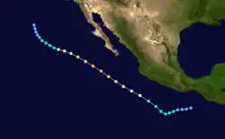 The origins of Darby can be traced back to a tropical wave that emerged off the African coast on June 19.[1] The wave tracked westward across the Atlantic Ocean without further development, eventually passing over the Caribbean Sea and tracked over Mexico. The wave reached in the Pacific on June 29,[1] as its organization began to improve. The system was designated Tropical Depression 5-E on July 2 while moving southwest as it continued to organize. On July 4, the depression attained tropical storm status and was named "Darby".[1] The tropical storm intensified to hurricane status as it brushed by the southern tip of Baja California. Although the storm remained well offshore, it contained a large circulation which produced tropical storm force winds extending up to 300 miles (480 km) away from the center.[2] As Darby passed by, Socorro Island recorded a minimum pressure of 974 hPa.[2] The storm then reached its peak intensity of 968 hPa before beginning a weakening trend due to colder waters.[1]