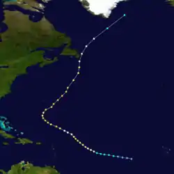 On August 23, the storm began a weakening trend and it turned towards the north.[1] The next day, the storm—having weakened to Category 1 status—skirted the southeastern tip of Newfoundland.[7] Debbie began to lose its tropical characteristics as it accelerated towards the northeast,[8] and it weakened into a tropical storm early on August 25.[1] As it moved over increasingly cold waters, it dissipated east of Greenland.[5]