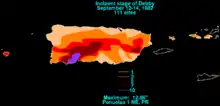 Rainfalls from Debby in Puerto Rico ranged between 3 inches (76 mm) around the northern end of the island to 10 inches (250 mm) in the southern ridge of the island. Rains on the island peaked at 12.86 inches (326 mm) in Penuelas. The U.S. Virgin Islands reported rain of about 3 inches (76 mm), while about 5 inches (130 mm) of precipitation fell in Dominican Republic.[9] The United States Navy removed its 700 personnel on Bermuda's Air Force Base, placing them in a gymnasium nearby. Thousands of tourists took last-minute flights out of Bermuda on September 16 as Debby drew near. Some of the airlines had pulled back the number of flights going in and out of the island. Eastern Airlines dropped from five flights to two, with them going to only New York City, Newark, New Jersey and Boston, Massachusetts.[10]